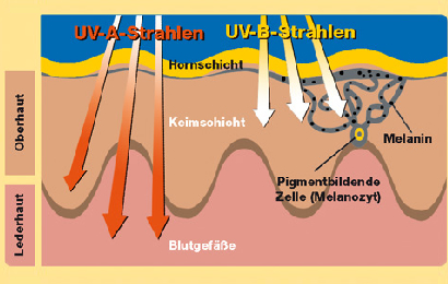 Bereits geringe Mengen UVB oder hohe Intensitäten an UVA-Strahlung fördern in speziellen Bräunerzellen, den Melanozyten, die Pigmentneubildung (Melanogenese). Die neu gebildeten Pigmente steigen in ca. 2 bis 5 Tagen an die Hautoberfläche und werden durch UVA-Strahlen unter Zuhilfenahme von Blutsauerstoff nachhaltig gedunkelt. Dadurch entsteht eine natürlich aussehende, frische Bräune. Durch regelmäßige Besonnung wird die Tönung der Haut immer intensiver und die oberste Hautschicht (Epidermis) verdickt sich und bildet die Lichtschwiele. Die Haut bildet dadurch ihren natürlichen Sonnenschutz. So können Sie einen hauteigenen Lichtschutzfaktor von vier bis acht erreichen. Der Vorteil der Besonnung im Solarium ist die kontrollierte und genau dosierte Besonnung für jeden Hauttyp, denn im Gegensatz zur natürlichen Sonne kann hier eine hauttypengerechte Besonnung erfolgen. Es gibt sechs Hauttypen die jeweils unterschiedlich auf Besonnung reagieren. Um eine optimale Besonnungszeit für Ihren Hauttyp zu garantieren, spielen Kriterien wie Augen-, Haut-, und Haarfarbe eine große Bedeutung.